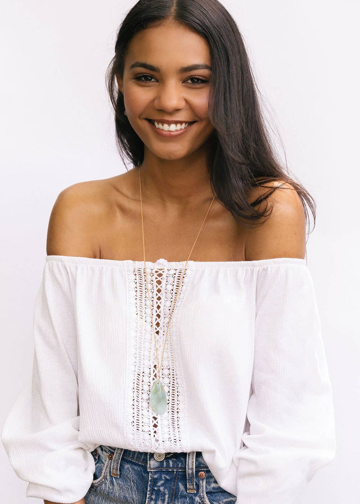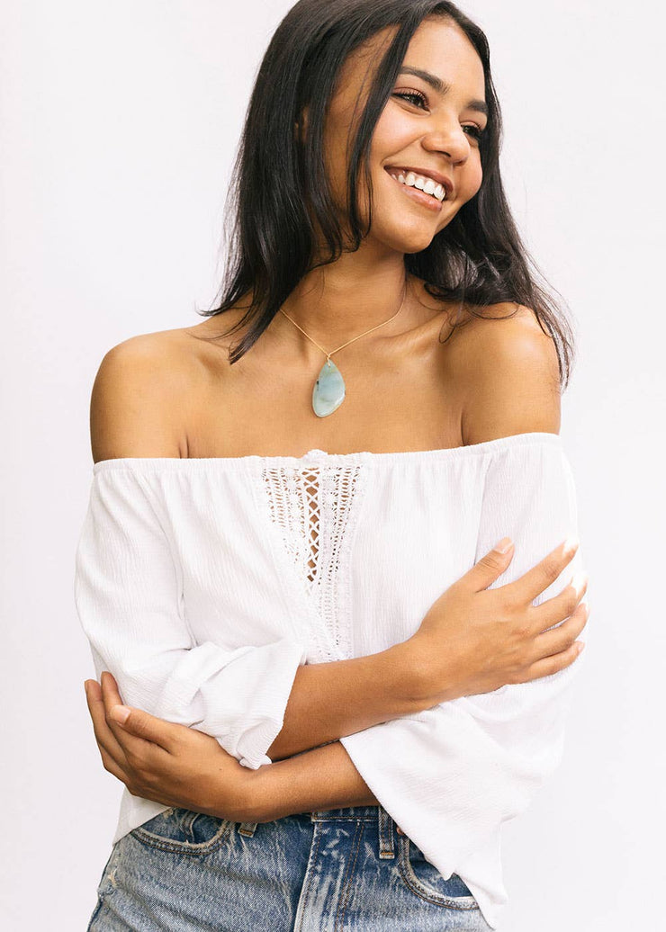 Adjustable necklace style features a paddle “touchstone” shaped gem as a daily reminder of your truth. These sweet stones warm with your body’s heat, exude healing energies, and can literally be grasped onto throughout the day to help you remember your truth.